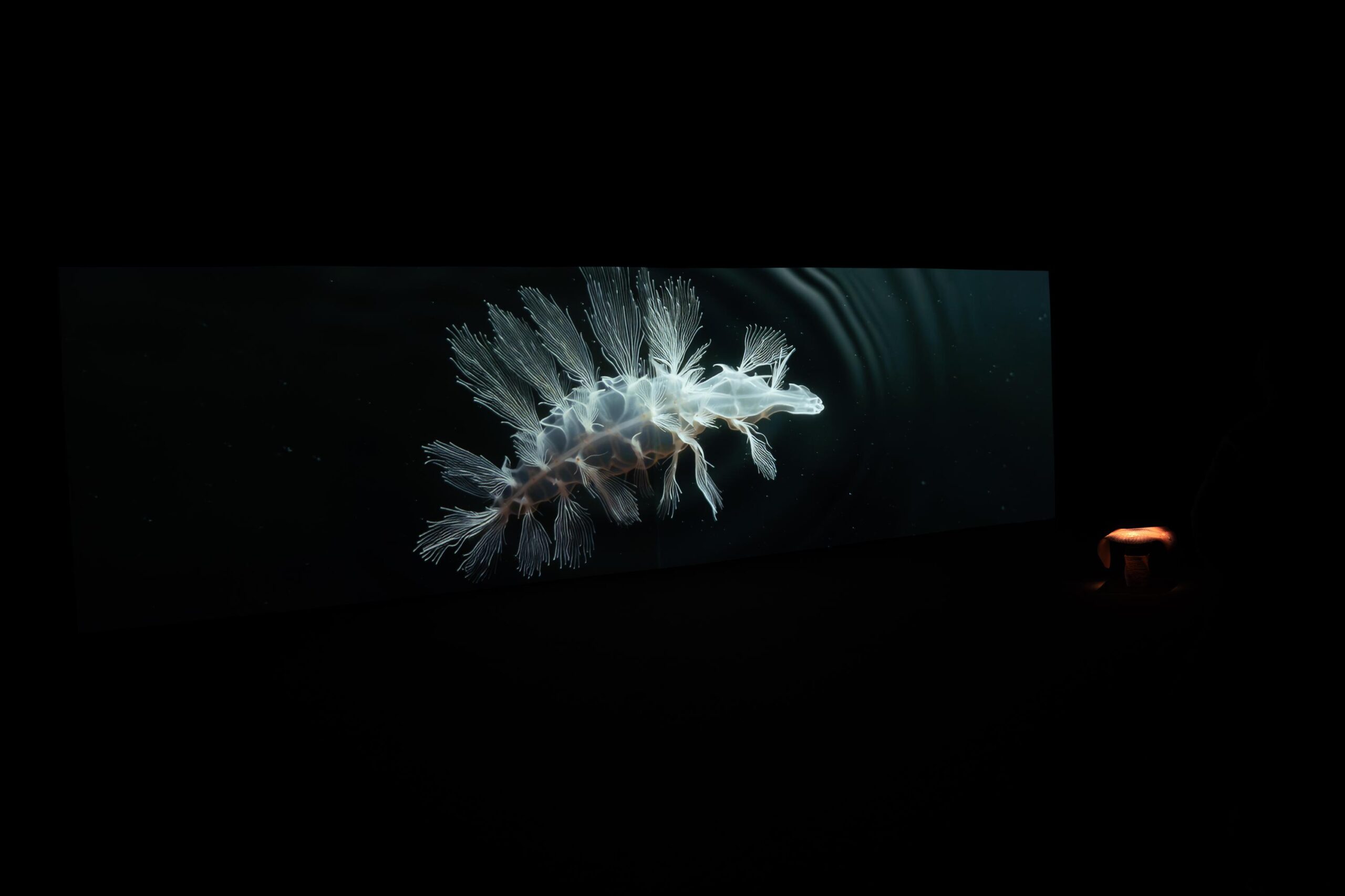 L’installazione prende forma attorno a due presenze che appartengono a scale temporali radicalmente diverse. Strudiella devonica, fossile del Devoniano rinvenuto in Belgio, richiama il tempo geologico profondo, un mondo fluviale anteriore alla presenza umana, capace di attraversare milioni di anni come archivio naturale. Il salmone atlantico, al contrario, incarna il tempo fragile del presente, una specie migratoria, la cui sopravvivenza riflette lo stato di salute dei fiumi contemporanei. Nel dialogo tra queste due forme di vita, Fossilized Futures attraversa ecosistemi scomparsi ed emergenze ecologiche attuali, lasciando emergere il fiume come luogo in cui tempi profondi e presenti vulnerabili si incontrano.