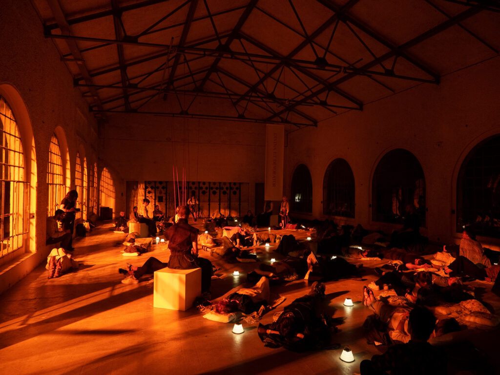 La performance si articola in due momenti: una prima parte introduttiva, dove prende corpo una geografia immaginaria fatta di alleanze tra specie e diplomazie oniriche. Nella seconda parte, il pubblico è accolto in uno spazio immersivo: distes3 su cuscini e coperte, si viene guidat3 da suoni, voci e rituali in un viaggio collettivo attraverso sogni condivisi. Insieme, si coltivano sogni, individuali e collettivi, come forme di conoscenza condivisa, oltre i confini dell’umano.
