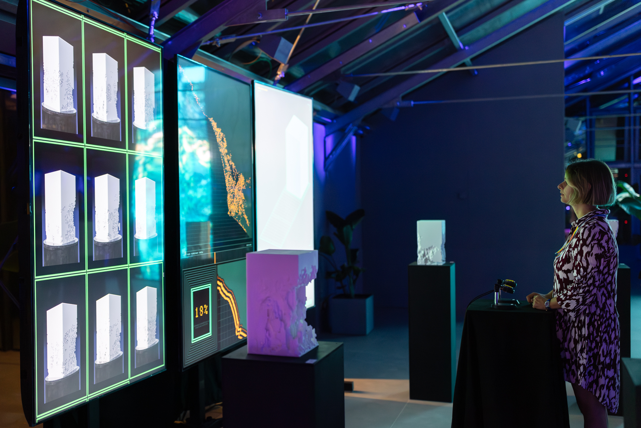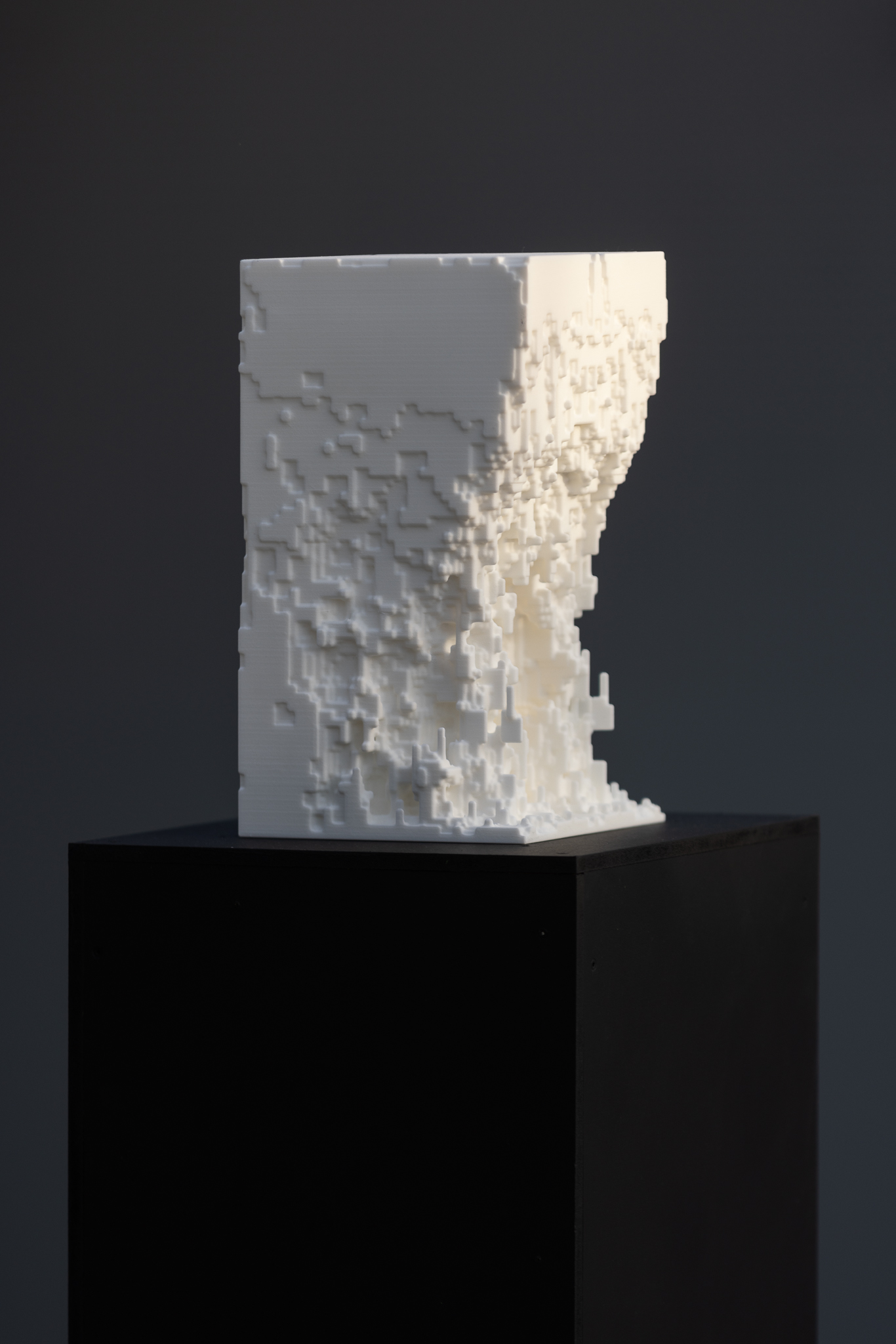 Tales from the Receding Edge prende forma a partire dall’osservazione delle cosiddette wave dynamics (altezza e frequenza delle onde, direzione delle onde, dati sulle maree), e dalla raccolta di dati geologici e geofisici delle aree costiere (variazione dei profili, tracce di subsidenza del terreno, deposito dei sedimenti), dallo studio della frequenza, durata e intensità delle tempeste e dall’osservazione del livello del mare (incremento del livello dell’acqua, temperatura della superficie, correnti oceaniche). Grazie alla capacità di astrazione dell’arte generativa, della data visualization e della stampa 3D, questa mole di informazioni è trasformata dall’artista in una serie di simulazioni idrodinamiche, geofisiche e meteorologiche che consentono allo spettatore di osservare in tempo reale, ma anche di predire in maniera interattiva, il comportamento di eventi atmosferici massivi sulle zone costiere italiane.