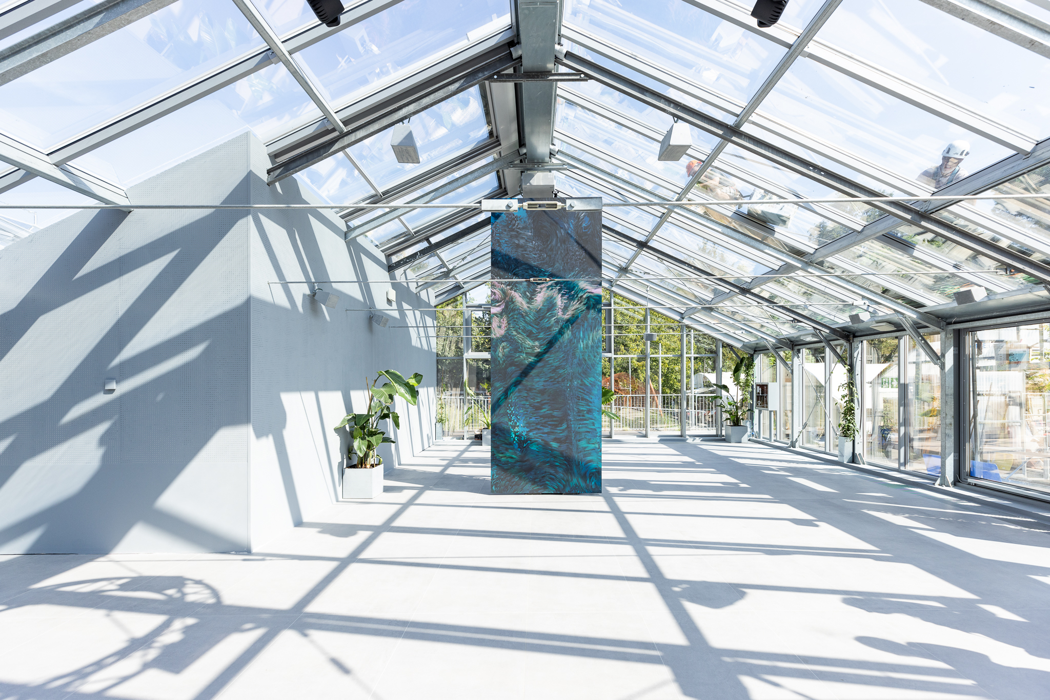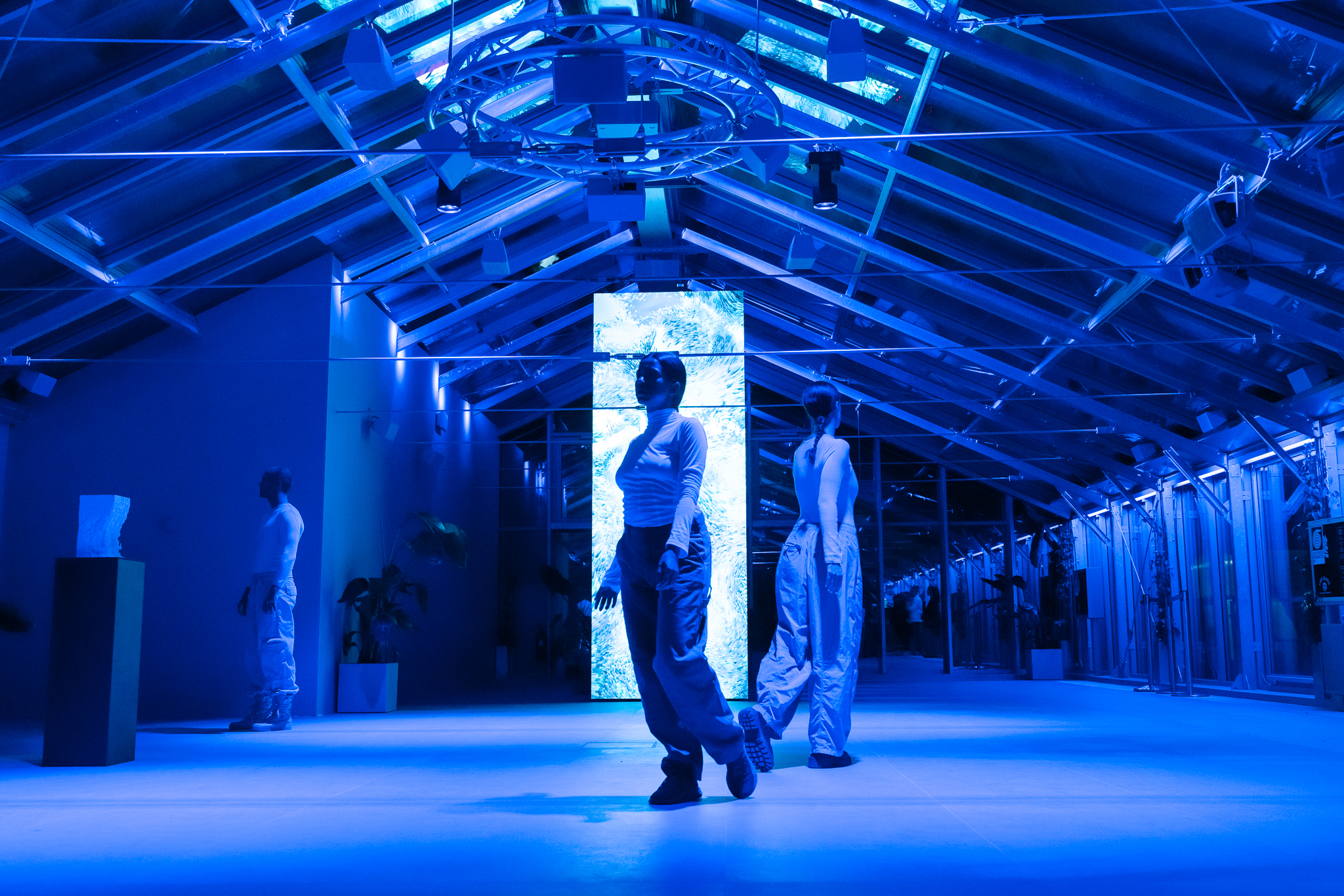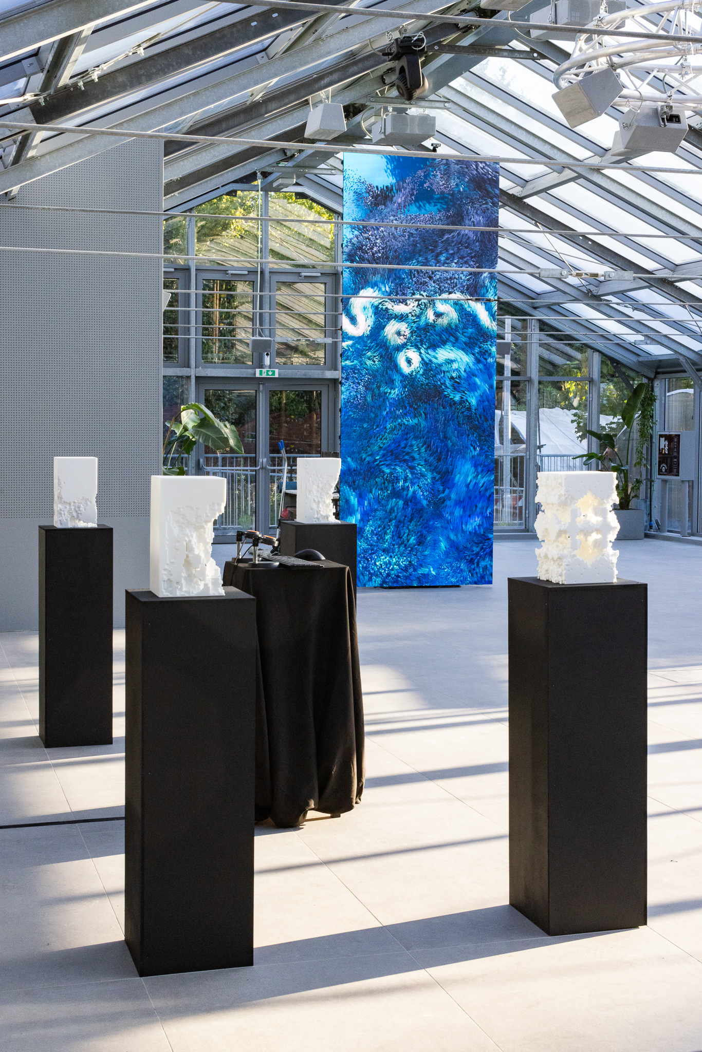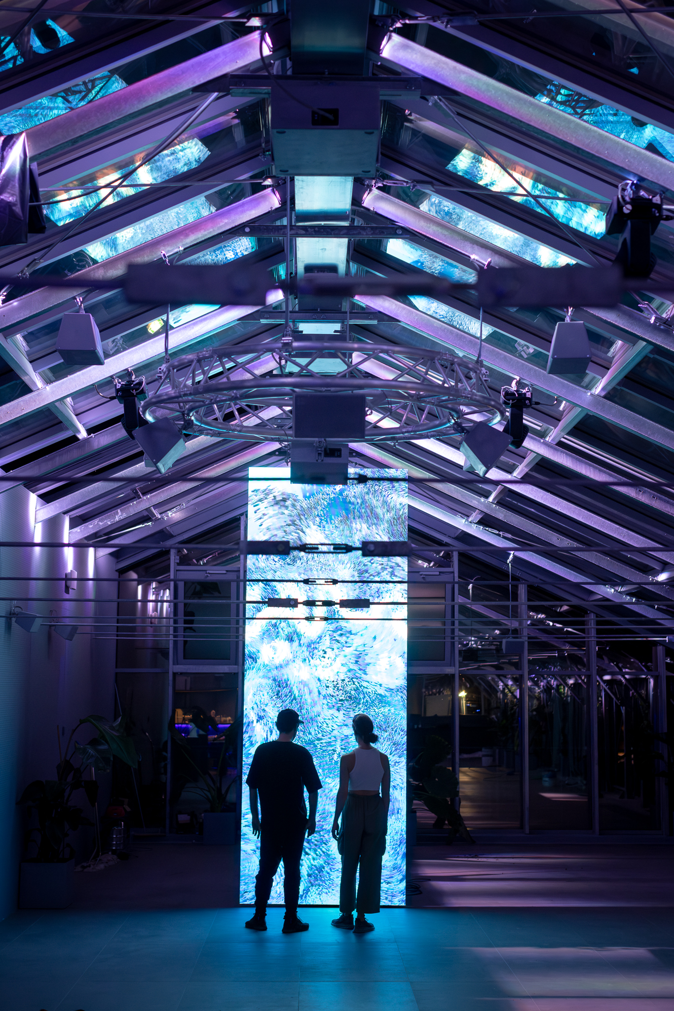 Fulcro della performance è uno schermo monolitico di 2 metri di larghezza per 4 metri di altezza dotato di un sistema di tracciamento del movimento, che rende possibile l’interazione con gli spettatori. Alle base dell’installazione e dell’osservazione dell’ecosistema marino si trova un set di dati internazionali sul flusso oceanico e sulla propagazione del suono, raccolti insieme a Copernicus, CMCC (Centro Euro-Mediterraneo sui Cambiamenti Climatici) e OGS (Istituto Nazionale di Oceanografia e di Geofisica Sperimentale).